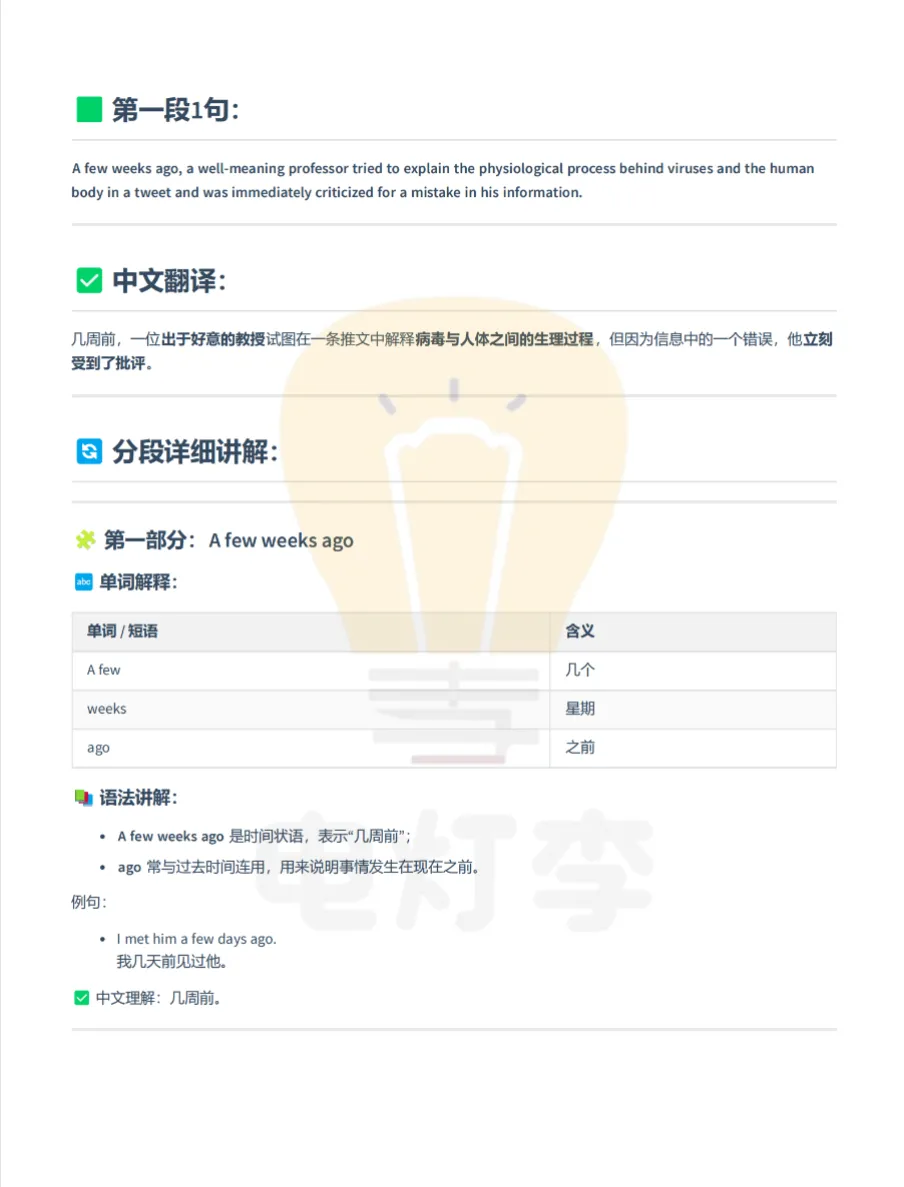 A few weeks ago 是时间状语,表示“几周前”; ago 常与过去时间连用,用来说明事情发生在现在之前。