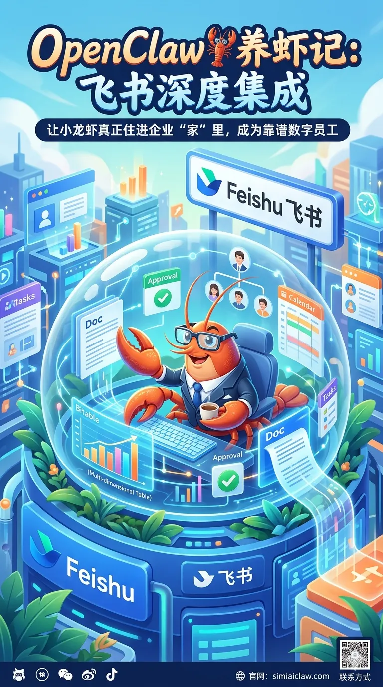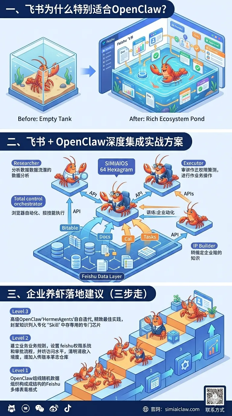 下面我把飞书 + OpenClaw深度集成的实战方案,结合SIMIAIOS 64卦虾群,系统拆解清楚,让企业能真正落地。