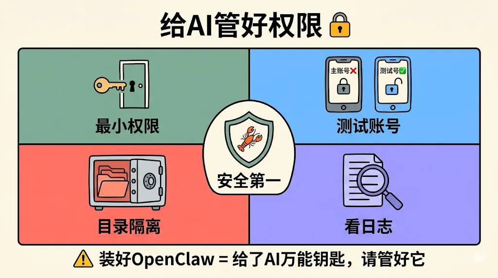 刚装好的时候,别急着给它太大权限。先让它干点简单的活,观察一段时间再逐步放开。
