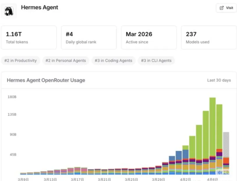 伴随讨论热度不断上升,一组亮眼的数据也随之显现:Hermes 在 GitHub 上的 Star 数短期内快速增长,目前已突破 35k。OpenRouter 上的 token 消耗量自 3 月下旬起明显提速,单日用量屡创新高,全球日调用排名一度跻身前列。同时,Hermes 在生产力、个人智能体、代码智能体等多个榜单中均位居上游,对于一个上线不足两个月的 Agent 框架来说,这样的表现十分罕见。