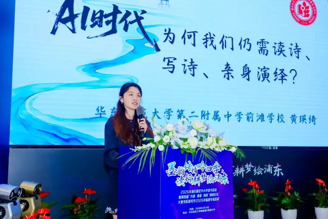 华东师大二附中前滩学校黄瑛绮老师作了题为《AI时代:为何我们仍需读诗、写诗、亲身演绎》的案例分享,从一线语文教师的视角,回答“AI时代为何仍需读诗写诗”。AI可以组合数据、模拟场景,却无法替代生命律动带来的独特表达,无法替代危机中挺身而出的责任担当,更无法替代指尖触碰千年智慧时的切身体认。教育的使命,正是通过诗会、戏剧、文化探究等融合性实践,激发卓然独立的思考与越而胜己的超越。