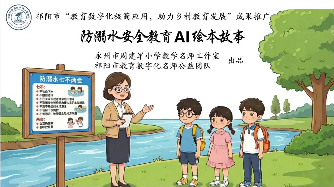 防溺水安全教育 AI 绘本故事微课程是永州市周建军小学数学名师工作室联合祁阳市数字化名师公益团队,面向乡村中小学打造的乡村安全教育公益项目。课程紧扣中小学防溺水 “七不两会” 核心要求,以极简数字工具、AI 大模型与多平台整合应用为支撑,高效开发 17 个主题安全教育 AI 绘本微课程,精准破解乡村学校防溺水安全教育资源匮乏、形式单一等痛点,为乡村孩子筑牢生命安全防线。