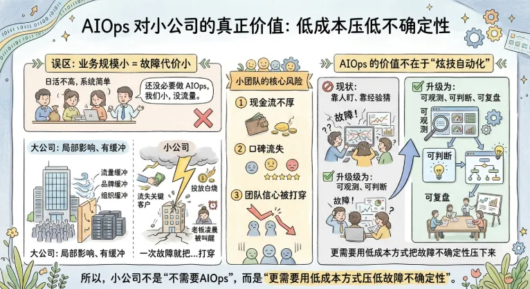 所以,小公司不是“不需要AIOps”,而是更需要用低成本方式,把故障不确定性压下来。