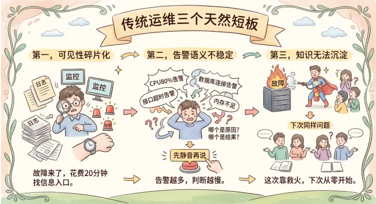 第一,可见性碎片化。 日志在一处、监控在一处、告警在另一处。故障来了,先花20分钟“找信息入口”。