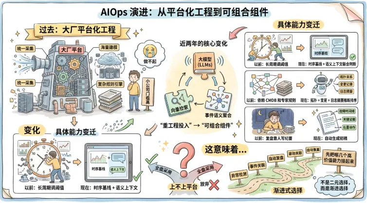 过去提AIOps,默认是“大厂平台化工程”:统一采集、海量建模、复杂规则引擎。小公司听完只会得出一个结论:做不起。