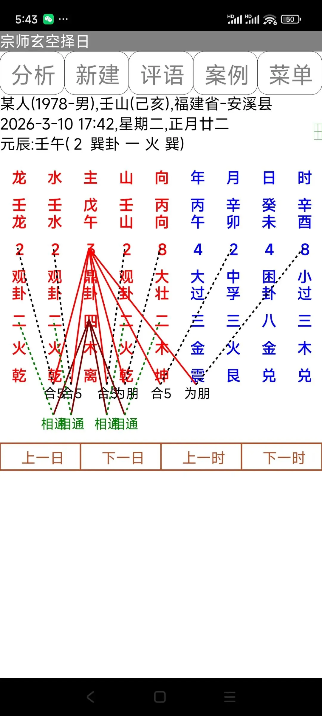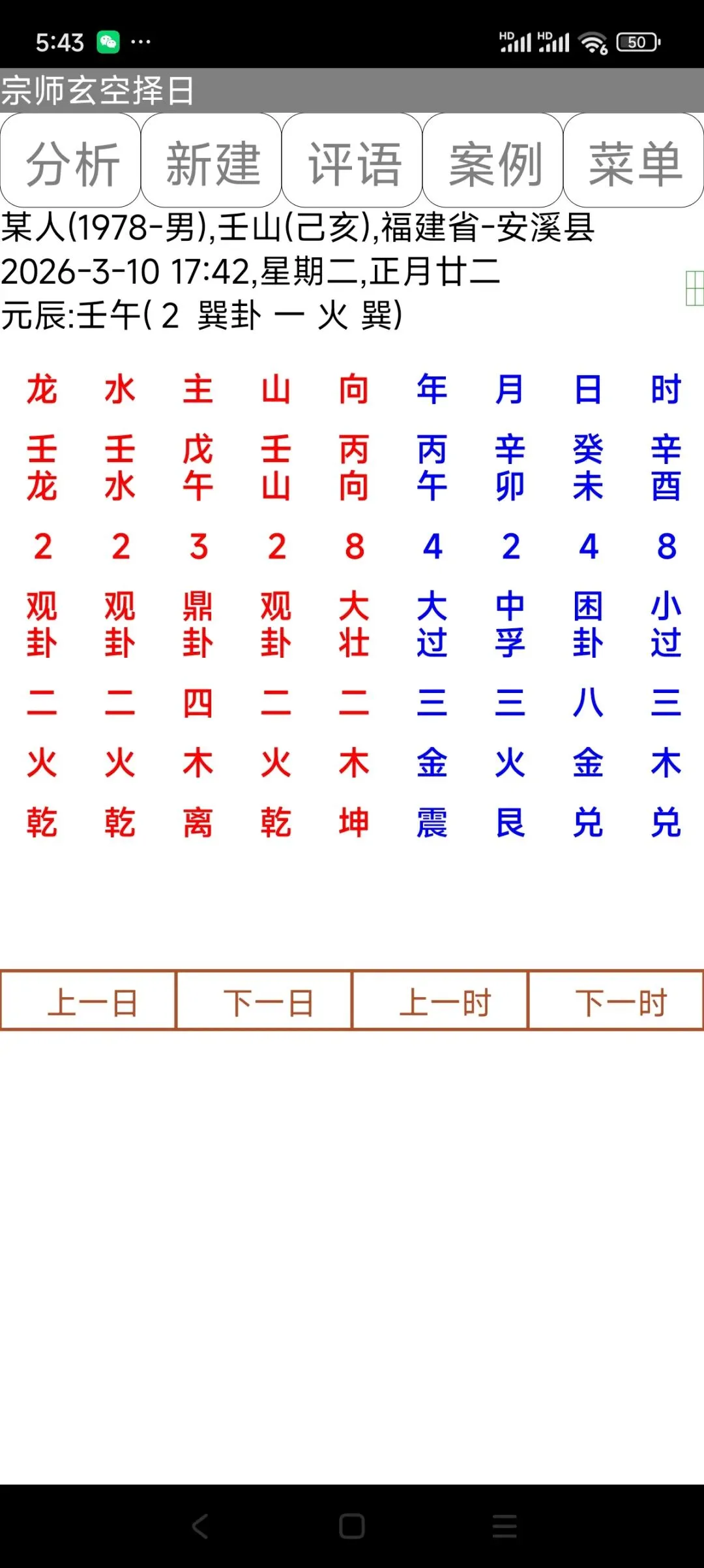 6:点击择日盘下面的“上一日”、“下一日”、“上一时”、“下一时”,可以快速改变当前时间排盘。