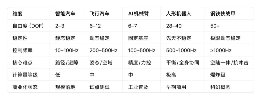 运动控制的复杂度,直接决定了智能体的能力天花板。而具身智能的自由度越高、环境越不可控、平衡越脆弱,控制难度指数级爆炸。我们把主流形态放在同一标尺上对比,让你更好理解