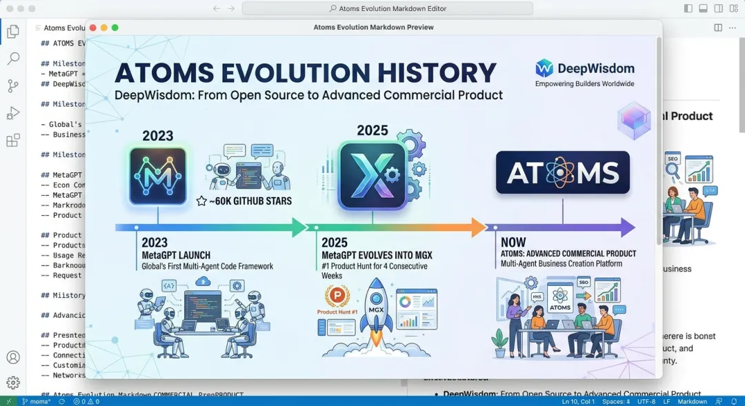 今天我们继续拆解 DeepWisdom 旗下的核心产品 —— Atoms。这是一款把 “创业” 变成普通人也能一键操作的 AI 平台,从 0 到 1,完全无需代码。