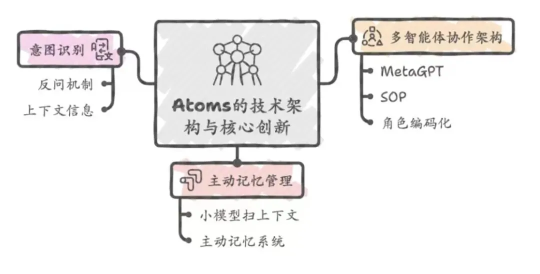 Atoms 的底层架构继承自 MetaGPT。不同 AI 负责不同岗位,像真实公司一样合作: