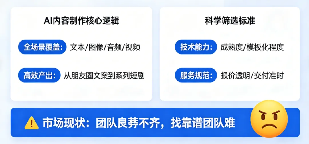 但随之而来的是市场上AI内容代做团队良莠不齐,很多人陷入“找团队难、找靠谱团队更难”的困境——要么技术不成熟,产出内容模板化严重;要么服务不规范,后期加价、交付延迟等问题频发。想要找到专业靠谱的AI内容代做团队,首先需要明确AI内容制作的核心逻辑,再掌握科学的筛选标准,才能精准匹配需求、规避合作风险。