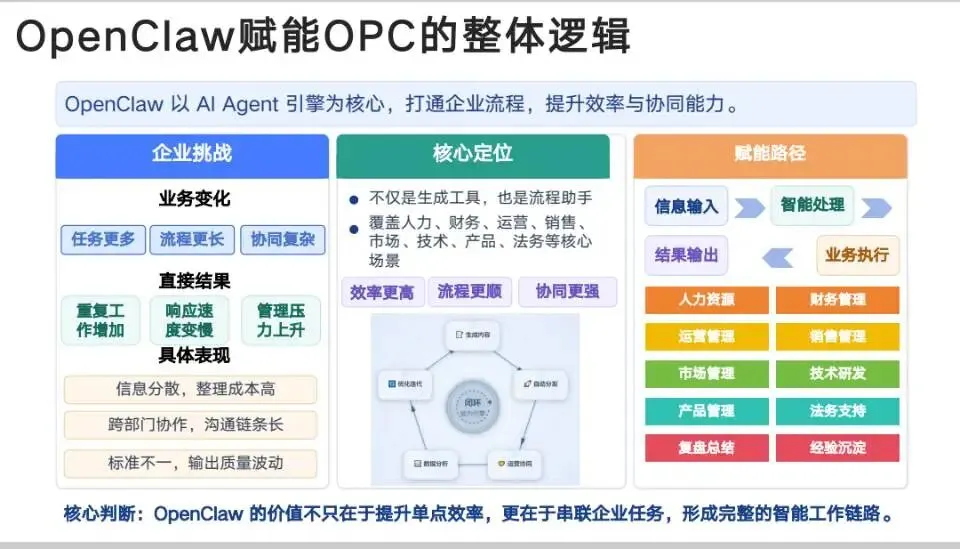 未来已来,AI不是取代人,而是解放人。因为OpenClaw的核心价值,不是单点提效,而是把全公司任务串成智能链路,让每个人从重复、机械、低价值的工作里解脱出来,去做更有创造力、更有温度、更有价值的事。