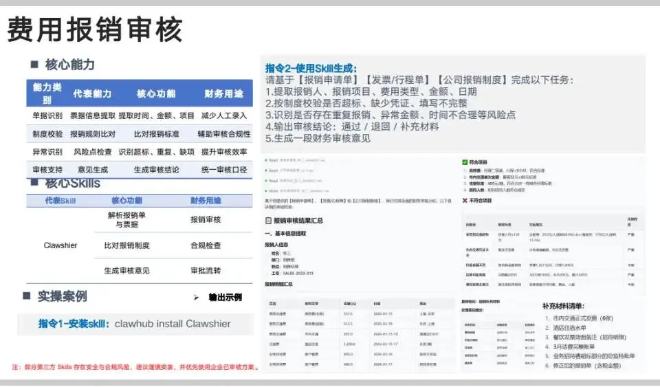 费用报销审核是神级功能。把报销单、发票、制度丢给AI,它自动提取金额、日期、事由,然后逐条核对标准,比如高铁是不是二等座、住宿有没有超标、餐费人均是否合规、发票有没有缺项等等。AI一秒就能揪出所有问题,列出补充材料清单,直接给出“退回补充”结论,连审核意见都写好。