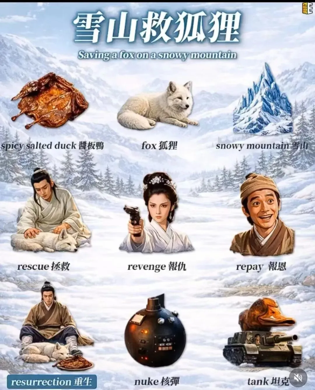 经典剧情早已刻进网友DNA:你在雪山救下一只纯白灵狐,满心期待它化身为绝色美女以身相许,可等来的不是报恩仙子,而是被你随手丢弃的酱板鸭。它化作怨念复仇者,嘶吼着“你还记得被你丢掉的酱板鸭吗?”疯狂索命,你当场毙命,随即轮回重启,再次在雪山救狐、再次被索命,陷入无限循环的绝望深渊。