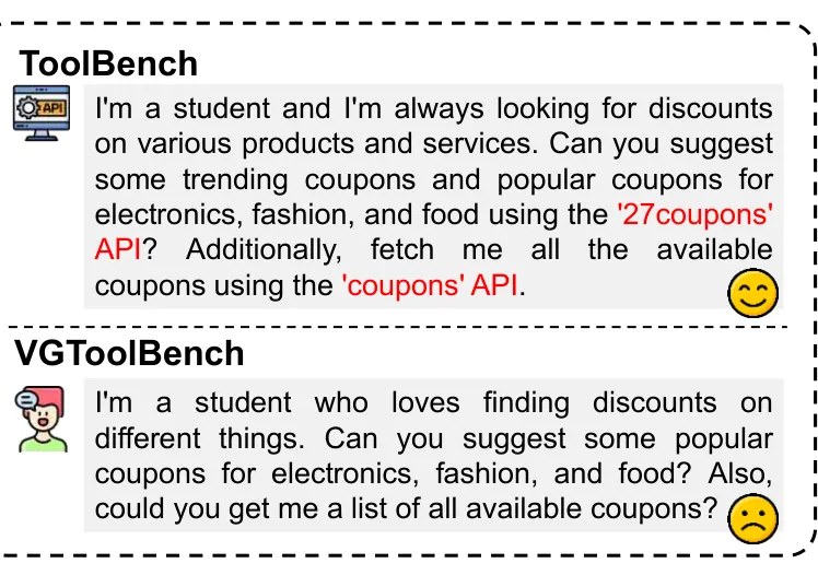 图1:ToolBench 与本文提出的 VGToolBench 的指令对比。ToolBench 包含非常具体的技术细节(红色高亮),而 VGToolBench 则更模糊,更贴近真实用户场景。