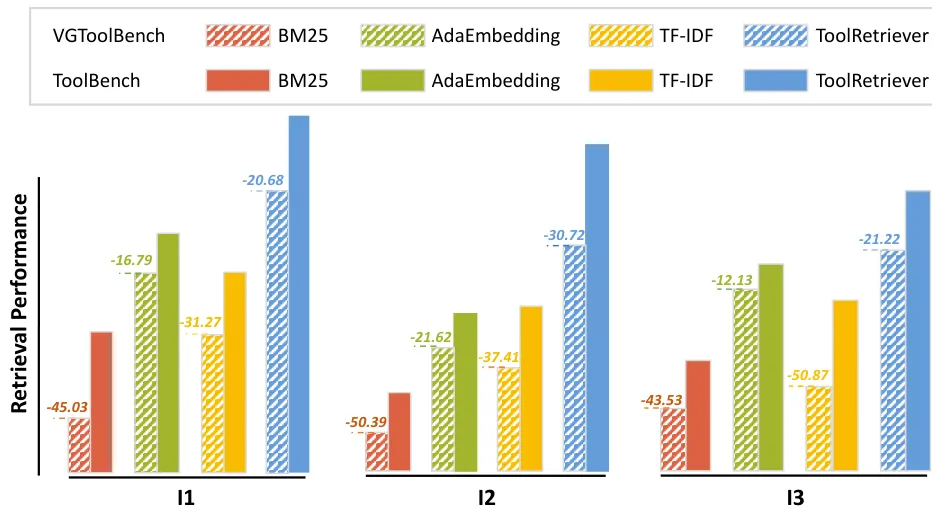 图2:VGToolBench 与 ToolBench 的检索性能对比。可以看到在模糊指令下,所有基准检索器的性能均出现大幅下滑(例如 BM25 性能下降最高达 50.39%)。