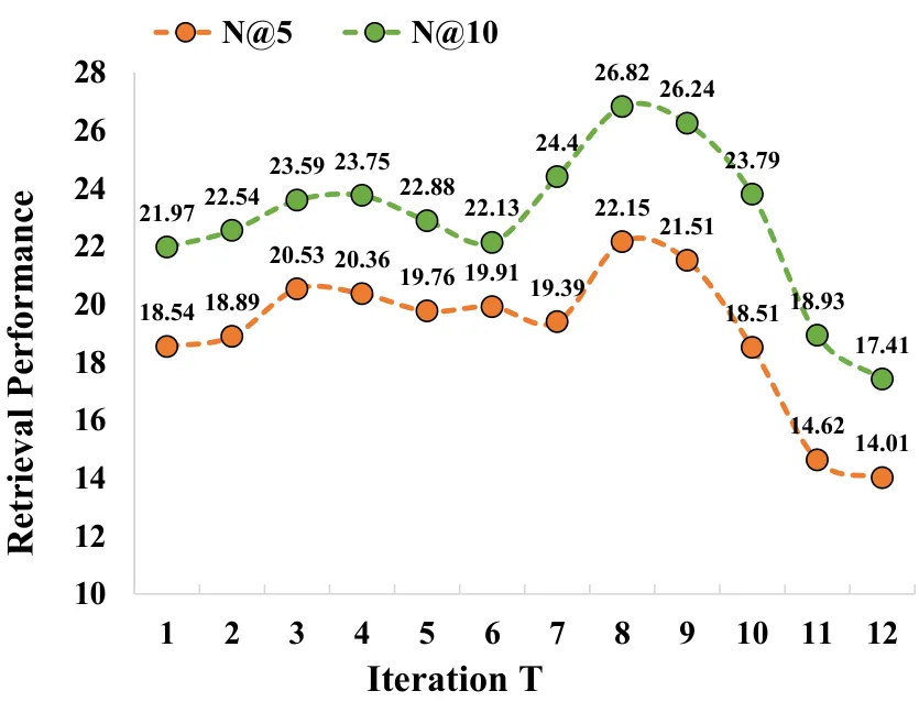 图4:迭代 DPO 训练中迭代次数 的影响。随着 增加,性能先上升后下降,表明适度迭代能改善质量,过度迭代可能导致模型过拟合偏好数据,失去生成多样性。实验中默认设为 。