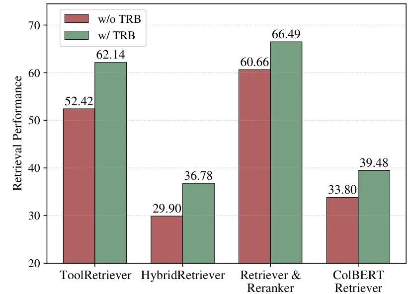 图5:TRB 加持在 SOTA 检索系统上的表现。TRB 对包括 Hybrid、Re-ranking 和 ColBERT 在内的复杂检索架构依然有效,均带来了一致的提升。