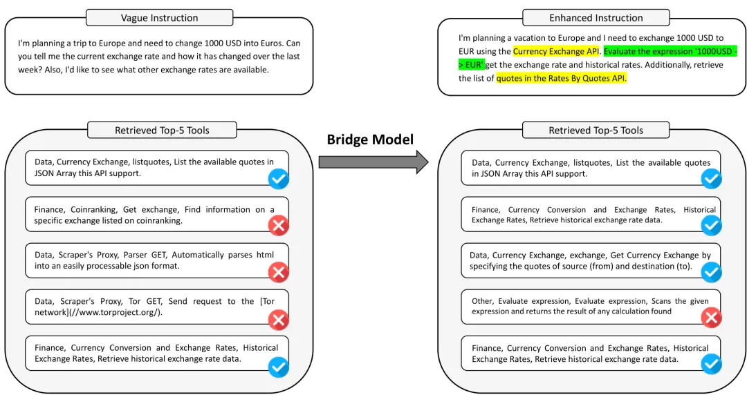 原文摘要: Tool learning has emerged as a promising paradigm for large language models (LLMs) to address real-world challenges. Due to the extensive and irregularly updated number of tools, tool retrieval for selecting the desired tool subset is essential. However, current tool retrieval methods are usually based on academic benchmarks containing overly detailed instructions (e.g., specific API names and parameters), while real-world instructions are more vague. Such a discrepancy would hinder the tool retrieval in real-world applications. In this paper, we first construct a new benchmark, VGToolBench, to simulate human vague instructions. Based on this, we conduct a series of preliminary analyses and find that vague instructions indeed damage the performance of tool retrieval. To this end, we propose a simple-yet-effective Tool Retrieval Bridge (TRB) approach to boost the performance of tool retrieval for vague instructions. The principle of TRB is to introduce a bridge model to rewrite the vague instructions into more specific ones and alleviate the gap between vague instructions and retriever preferences.We conduct extensive experiments under multiple commonly used retrieval settings, and the results show that TRB effectively mitigates the ambiguity of vague instructions while delivering consistent and substantial improvements across all baseline retrievers. For example, with the help of TRB, BM25 achieves a relative improvement of up to 111.51%, i.e., increasing the average NDCG score from 9.73 to 19.59. The source code and models are publicly available at https://github.com/kfchenhn/TRB.