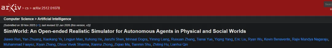 1. Ren, J., Zhuang, Y., Ye, X., Mao, L., He, X., Shen, J., Dogra, M., Liang, Y., Zhang, R., Yue, T., Yang, Y., Liu, E., Wu, R., Benavente, K., Nagaraju, R. M., Faayez, M., Zhang, X., Sharma, D. V., Zhong, X., Ma, Z., Shu, T., Hu, Z., & Qin, L. (2026). SimWorld: An Open-ended Realistic Simulator for Autonomous Agents in Physical and Social Worlds. arXiv:2512.01078v2. https://arxiv.org/abs/2512.01078