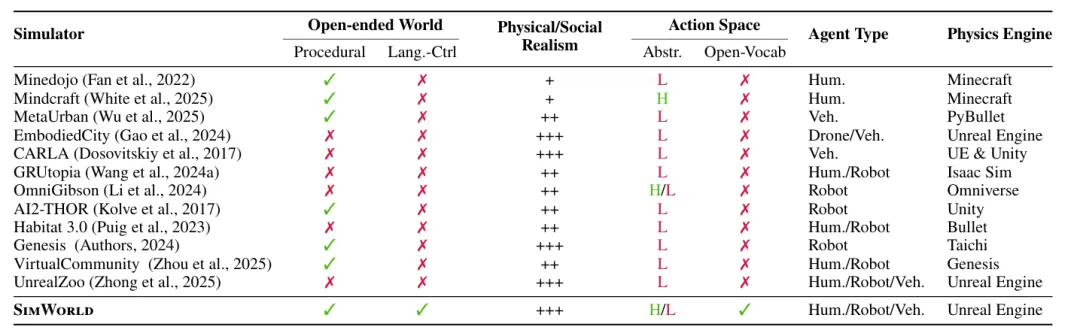 在“开放世界”(程序化生成+语言可控编辑)、“物理/社会真实度”、“动作空间”(抽象层级+开放词汇)等维度上,SimWorld是唯一全面打勾的模拟器。其他平台如Minedojo(Minecraft)、CARLA(自动驾驶)、Habitat 3.0(家庭机器人)、Genesis(机器人)等均在至少一个关键维度上缺失。