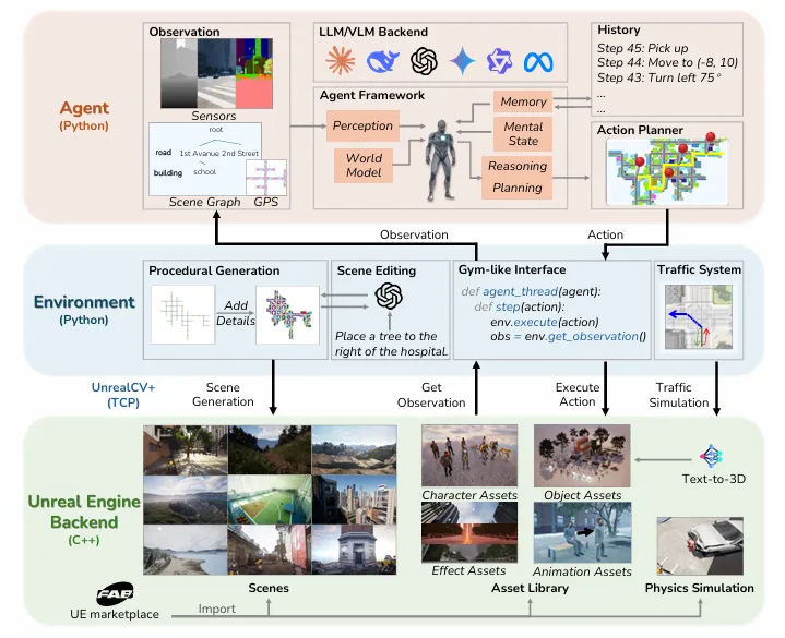 SimWorld采用三层架构(图2)如下。底层是虚幻引擎后端(C++),负责高保真渲染和物理模拟;中间是环境层(Python),提供程序化城市生成、交通系统和标准化的Gym-like接口;顶层是智能体层(Python),集成LLM/VLM推理引擎、观测空间和动作规划器。三层通过UnrealCV+通信模块(TCP协议)连接,形成完整的“感知-规划-行动”闭环。