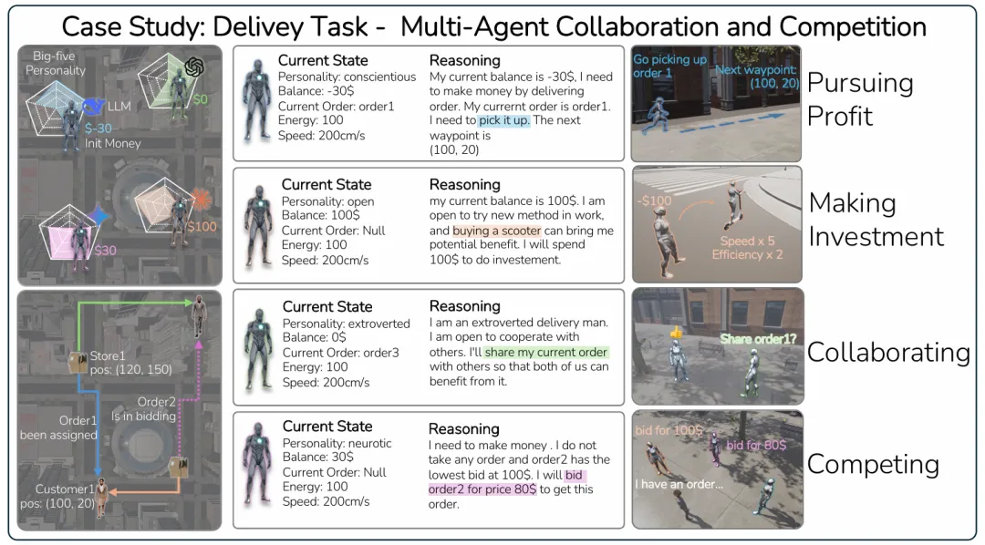 图3:配送任务概览。一个需要多智能体协作与竞争的配送场景。每个智能体被赋予不同的性格(尽责、开放、外向、神经质)和初始状态,可以行动以成长、发展并最终最大化收益。