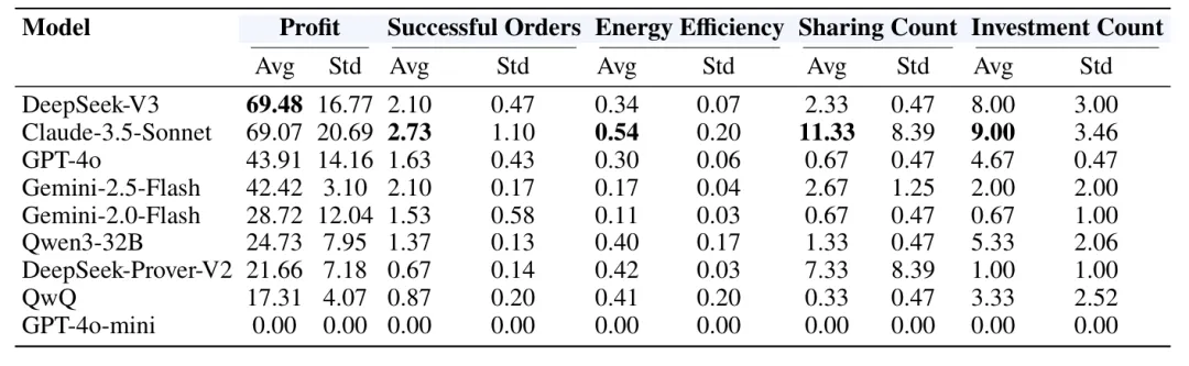 GPT-4o-mini的所有指标为零——利润 0.00、成功订单 0.00、能效 0.00、分享 0.00、投资 0.00。论文的判断是:“它并未真正理解目标,无法基于给定指令和上下文做出合理决策”("it does not truly understand the goals well enough to make reasonable decisions based on the given instructions and context")。