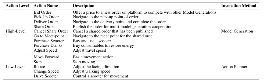 GPT-4o-mini 接收到了规则说明、订单推送和地图信息,在字面意义上“理解”了每一个句子,却无法将这些句子组织成一个可执行的目标。原文可见研究团队清晰地定义了高层动作——竞标、取货订单、配送订单、共享订单、购买滑板车、购买饮料等——但 GPT-4o-mini 无法将这些动作按因果顺序编排成一串可执行的序列。