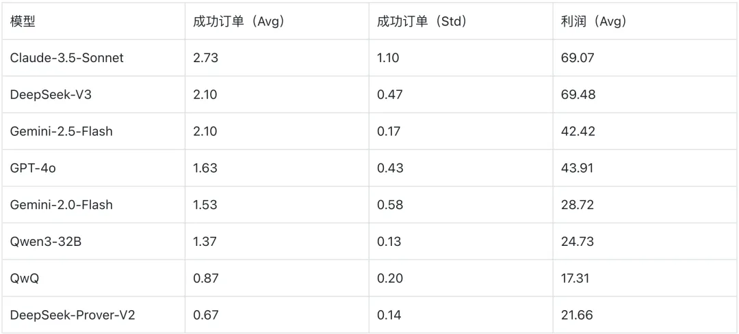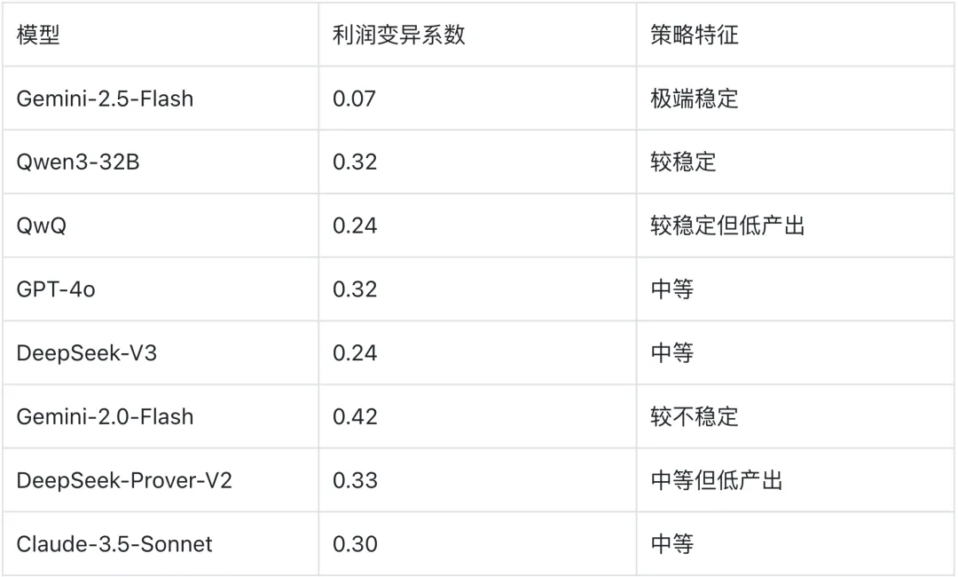 利润 vs. 稳定性。 DeepSeek-V3 和 Claude-3.5-Sonnet 像高风险高回报的投机者,利润最高但波动剧烈;Gemini-2.5-Flash 像保守的储蓄者,利润中等但几乎零波动;GPT-4o 像稳健的投资者,处于两者之间。