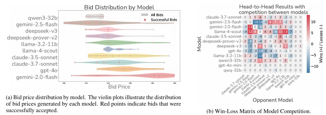 图6:竞价行为与评估结果。(a) 各模型的竞价价格分布(小提琴图),红色点为成功接受的竞价。低价虽然增加中标概率,但往往以利润率为代价。(b) 模型间两两对抗的胜-负矩阵,红色为更多胜利,蓝色为更多失败。
