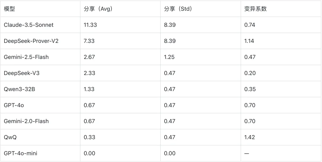 Claude-3.5-Sonnet 平均分享最多,但也不稳定。DeepSeek-Prover-V2 更极端——变异系数高达 1.14。这意味着两个模型在合作行为上的“判断力”是可疑的。它们不是因为评估了合作是否有利而选择分享,而更可能是因为推理链的随机性在某些运行中经过了“分享”语义区域。