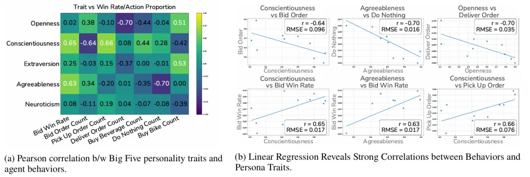 人格消融实验(Section 3.3)提供了策略一致性的另一个视角。论文使用表现最好的模型控制 20 个智能体,每个 Big Five 维度分配给 2 个智能体。Pearson 相关矩阵显示人格设定确实塑造了行为——尽责性与竞价胜率正相关(r = 0.65),宜人性与“什么都不做”强负相关,开放性与配送订单数负相关,开放性与购买滑板车正相关,外向性与购买饮料正相关。