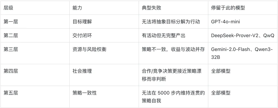 但这种排名掩盖了更有价值的信息,因为不同模型的失败模式并不相同,它们停在了“能力金字塔”的不同层级上。配送任务所需的能力可以被分解为五个递进的层级,每一层的失败都指向一种不同性质的认知缺陷。