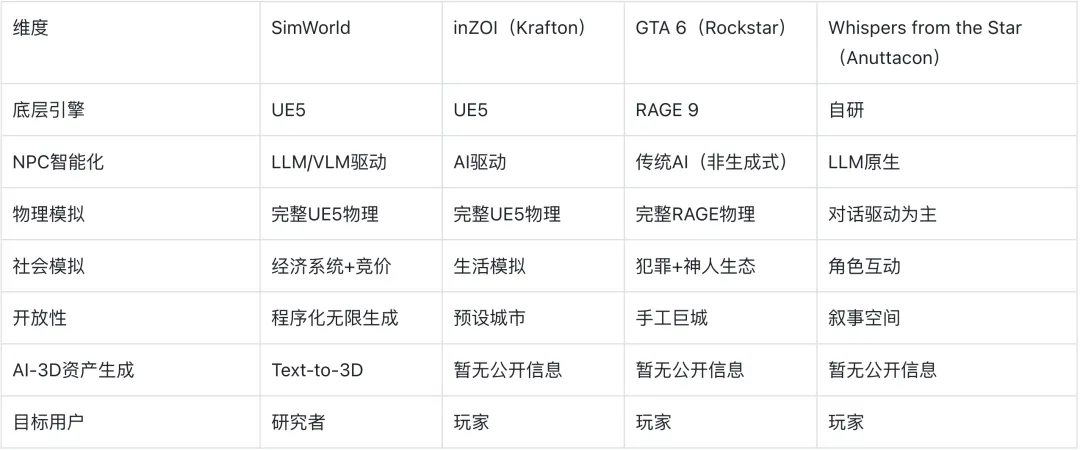 从Stanford Smallville的25个AI角色在一个简陋的2D像素小镇里过日子,到SimWorld把数十个LLM智能体放进虚幻引擎5构建的3D城市里送外卖——这条技术路径的演进速度令人瞩目。而当我们注意到Krafton用同一个引擎做《inZOI》、Rockstar为NPC导航系统申请专利、腾讯报告1.1亿用户已经体验过AI NPC时,会发现AI研究者和游戏开发者的工作正在从平行线变成交汇线。