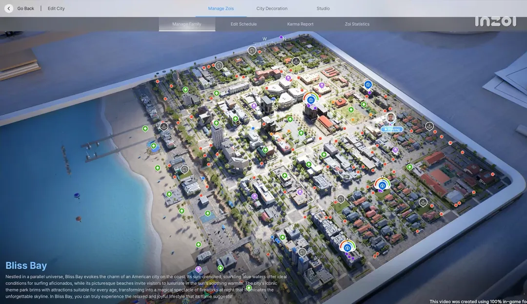 Krafton的《inZOI》同样基于UE5,同样追求全城同时模拟的体验——官网宣称“整个城市不断同时模拟”(the entire city is constantly being simulated all at once),在2025年以抢先体验形式上线Steam后,预计2026年上半年登陆PS5。它的NPC行为同样由AI驱动,只不过目的是娱乐玩家而非训练智能体。