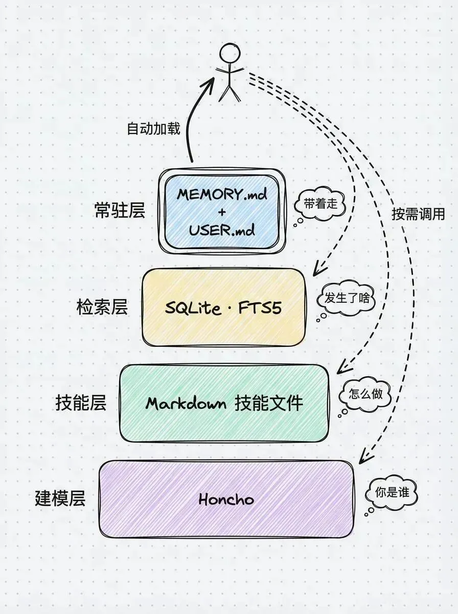 常驻层管「每次都要带着的东西」,会话检索管「发生了什么」,技能层管「该怎么做」,用户建模管「你是谁」。四层各司其职,不搅成一锅粥。