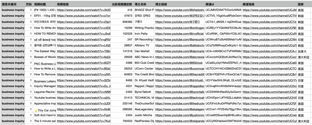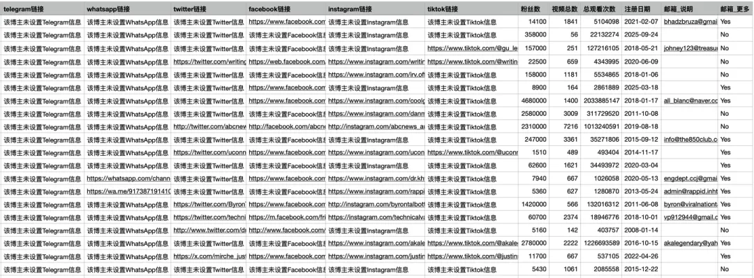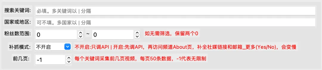 支持Windows/Mac双端运行,无需配置Python环境,打开即用! 软件通过调用油管官方api接口实现,无反爬风险 支持筛选:品牌关键词 / 国家地区 / 粉丝数范围 爬取过程中,每爬一条,存一次csv。并非爬完最后一次性保存,防止因异常中断导致丢失前面的数据(每条间隔1~2s,可自定义设置) 爬取过程中,有log文件详细记录运行过程,方便回溯 博主csv含22个核心字段:搜索关键词,页码,视频标题,视频链接,当前视频播放数,博主名称,博主链接,频道id,频道链接,国家,telegram链接,whatsapp链接,twitter链接,facebook链接,instagram链接,tiktok链接,粉丝数,视频总数,总观看次数,注册日期,邮箱_说明,邮箱_更多