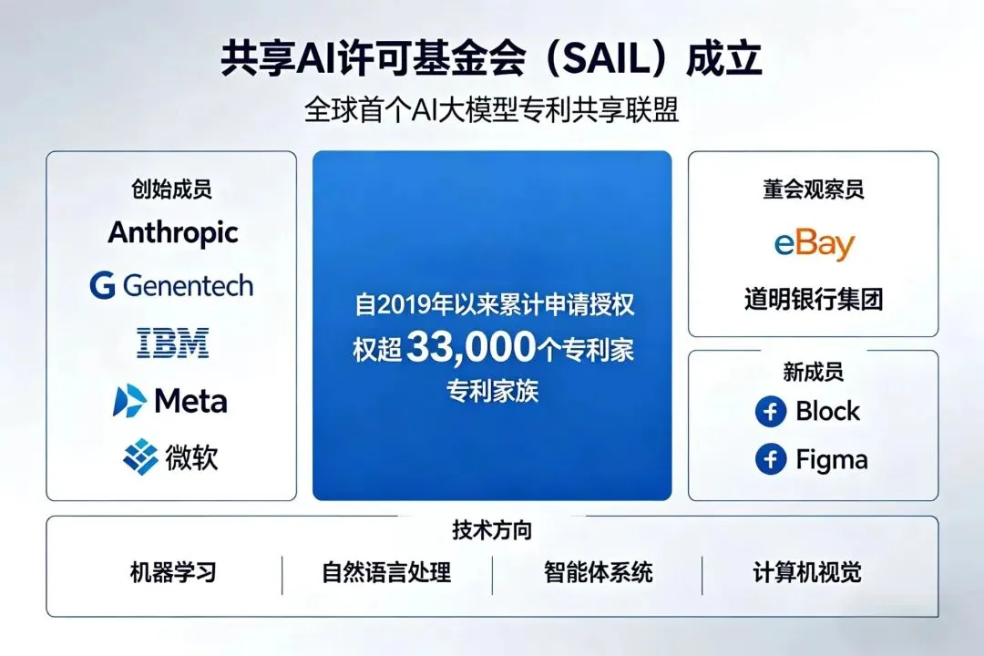 2026年4月8日,Anthropic、Genentech、IBM、Meta和微软联合宣布成立共享AI许可基金会(Shared AI License Foundation,简称SAIL),标志着全球首个专门面向AI大模型技术领域的专利共享联盟正式诞生。