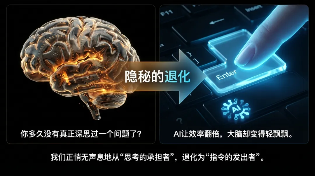 今天我们遇到任何问题,第一反应是打开对话框。AI能写方案、能做分析、能跑代码,甚至连"今晚吃什么"都想问一句。它太好用了——效率翻了倍,大脑却轻飘飘的。