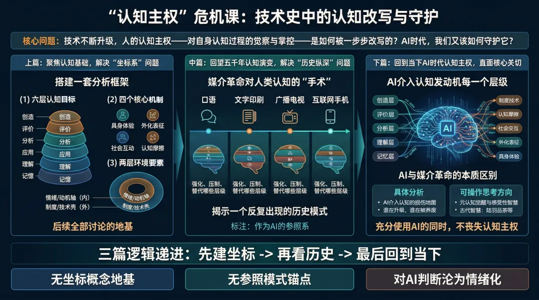 三篇的逻辑是递进的:先建坐标,再看历史,最后回到当下。 没有第一篇的概念地基,第二篇的历史分析就没有锚点;没有第二篇的纵深参照,第三篇对AI的判断就容易沦为情绪化的乐观或悲观。