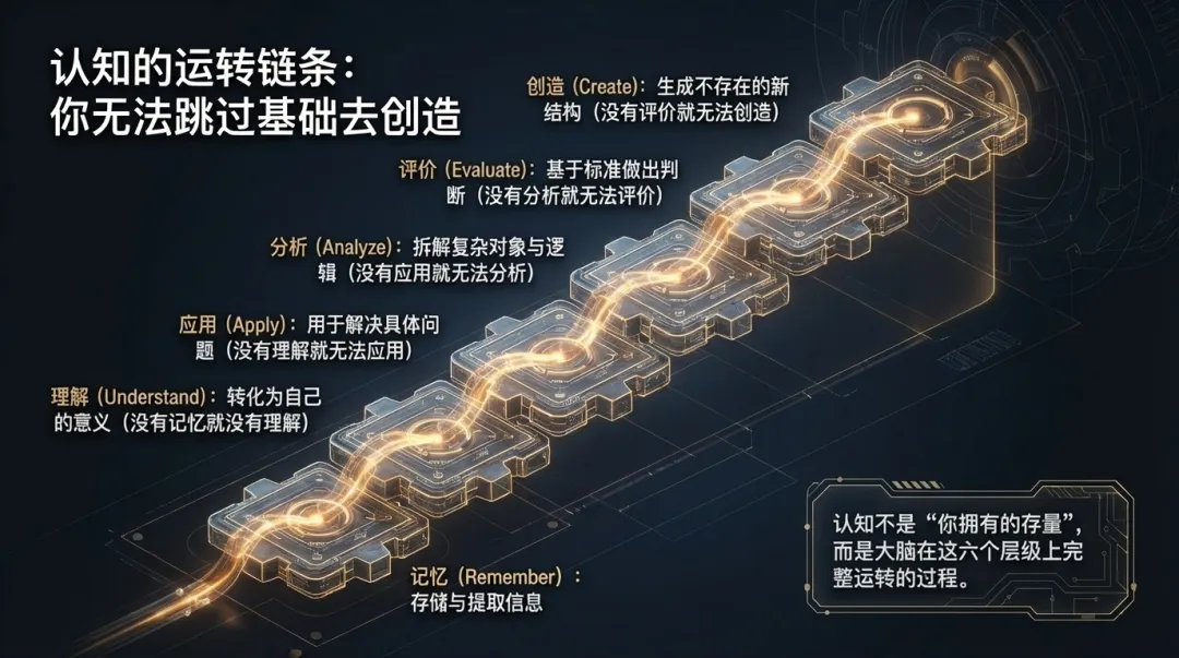 本篇将基于布鲁姆认知层级模型和认知科学的多个分支,搭建一套分析框架:六层认知目标层级、四个核心机制要素、两层影响环境。这是后续讨论的主要理论地基。