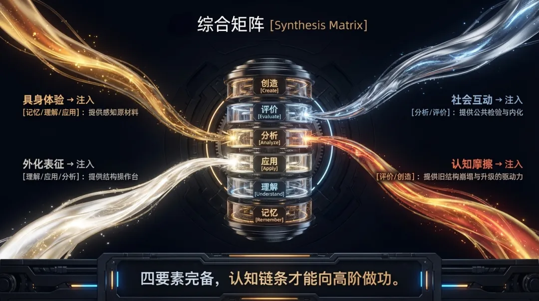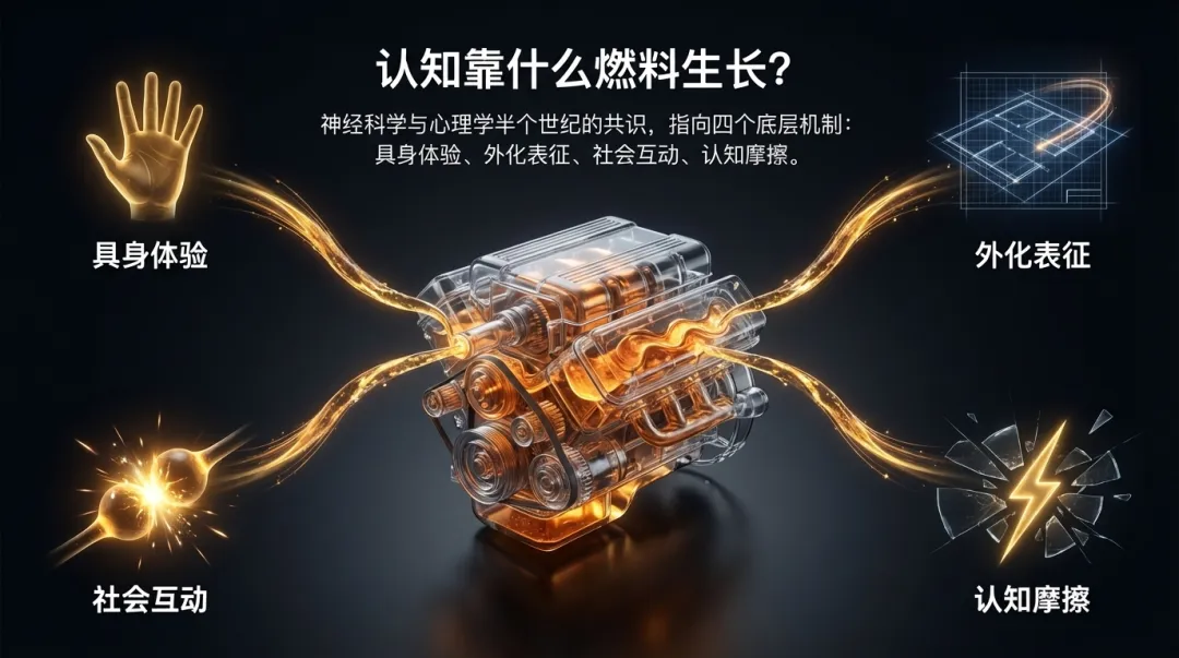 四个要素构成了从记忆到创造的完整生长通道——具身体验供料,外化表征搭架子,社会互动校准方向,认知摩擦逼发动机换挡。
