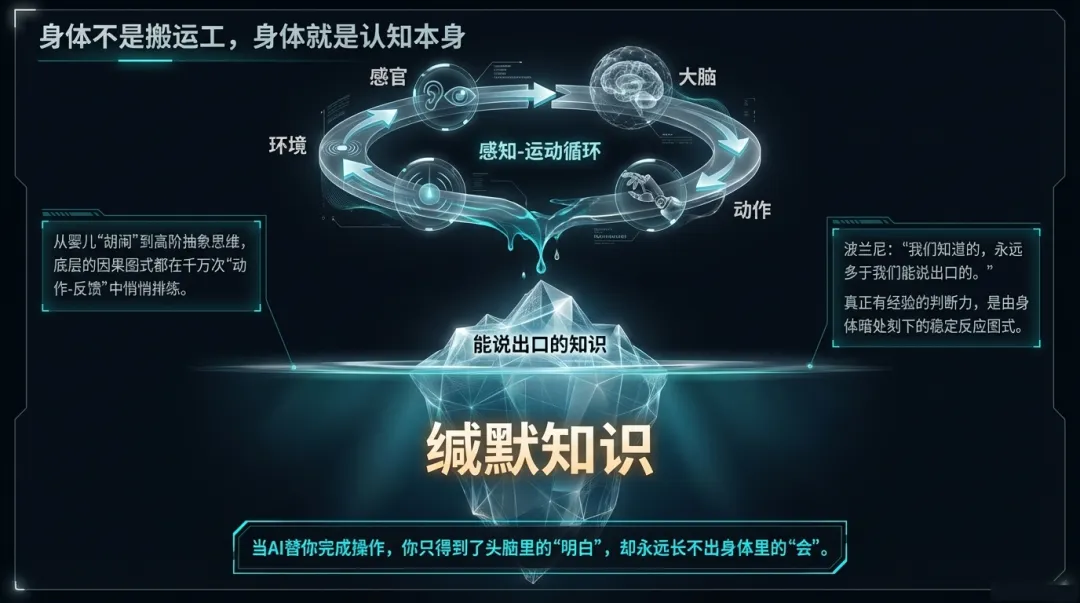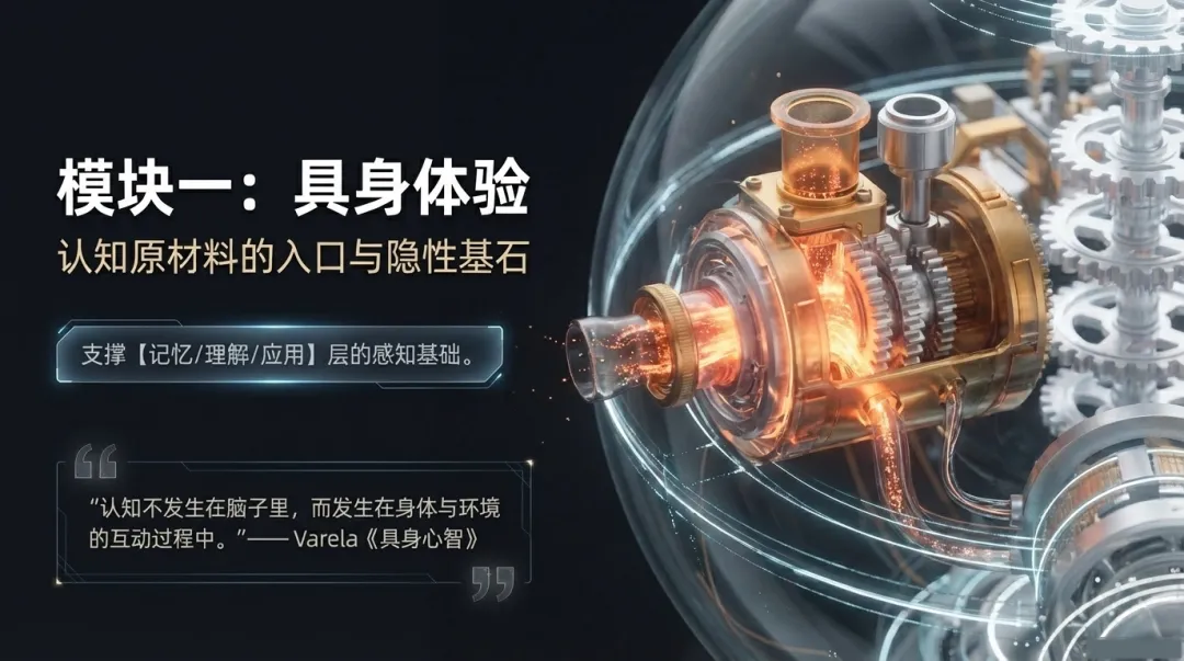 具身体验(Embodied Experience)——认知原材料的入口。认知从身体与环境的真实互动中生长,不是从"看懂别人的解释"中生长。