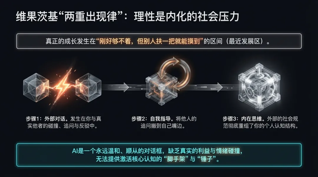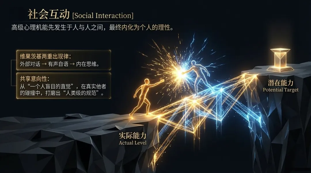 社会互动(Social Interaction)——认知校准的机制。高阶心理机能先发生在人际层面,再被个体内化。