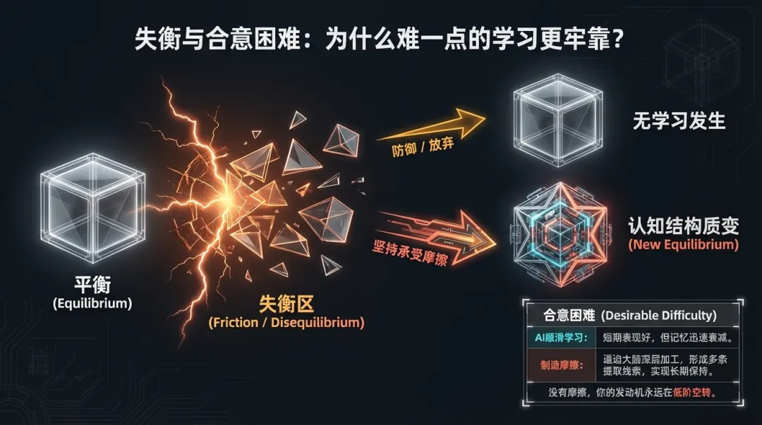 而在AI时代,如果所有"不懂""卡住""被质疑"的瞬间,都被一个温和、高效、永远在线的AI一键抚平——给你最通俗的解释、最完整的答案、最顺畅的路径——那失衡就永远不会发生,认知就永远不会升级。