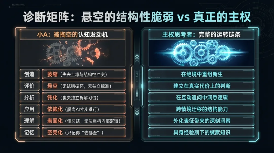 从外面看,小A依然很"高效"——他每天产出大量内容、完成大量任务、展示出看起来很"专业"的成果。但从里面看,他的认知链条已经从中间断裂了。上面的三层空有外壳,下面的三层交给了别人。