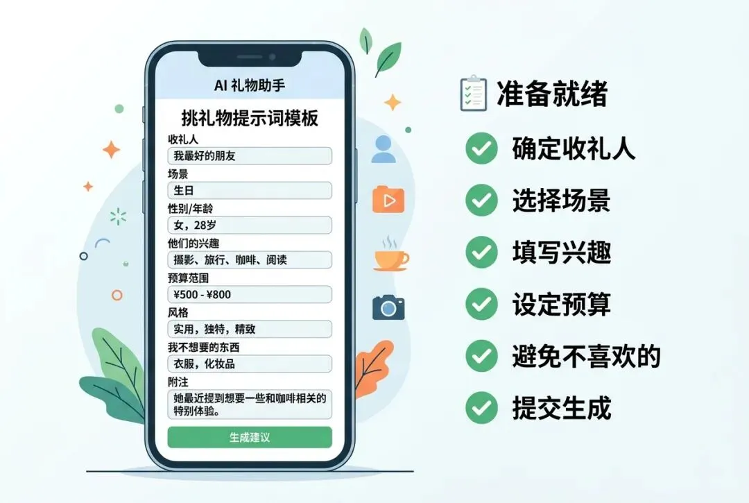 下次送礼前,试试问AI一句:"我要给[谁]挑礼物,预算[多少],你能帮我推荐吗?"