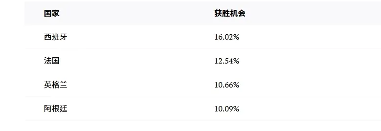 它同时还说明,这届世界杯的冠军大概率还是会从欧洲和南美传统强队里出,东道主里墨西哥1.74%、美国1.24%、加拿大0.82%,热度有,距离争冠线还有一段。