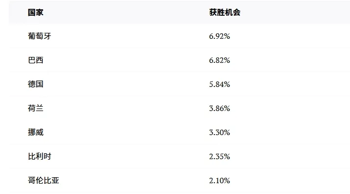 三队都在6%上下,说明模型认定他们都具备冲冠能力,可距离最顶层还有一点差距。 葡萄牙的问题在于上限很高,波动也不小;巴西的问题在于名字永远吓人,近年的大赛完成度却不够稳定;德国的优势是结构和比赛纪律,问题是这支队近几年一直没真正回到2014年之后那个最有统治力的区间。