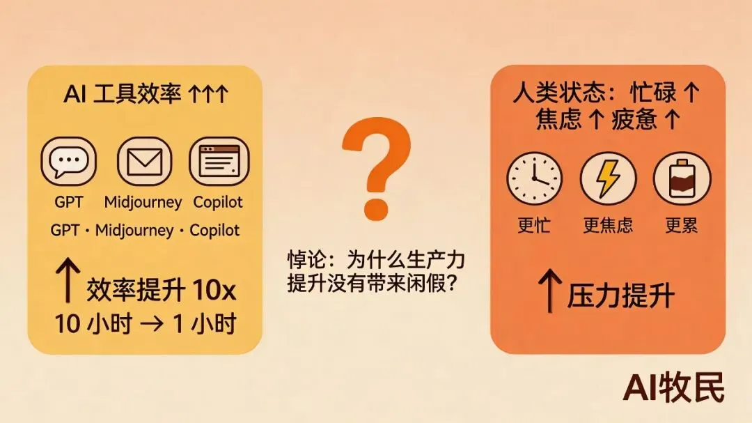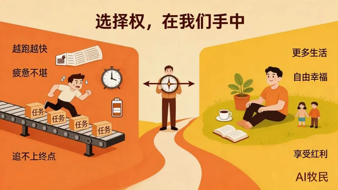 但如果我们把 AI 当作"解放人类的伙伴",那么我们就有机会真正享受技术带来的红利——不是更多的任务,而是更多的生活。